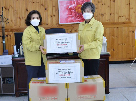| ▲전남 광주 서구의회가 방역 마스크 2천매를 대구 서구의회에 전달하고 있다.(사진=대구 서구의회 제공) |