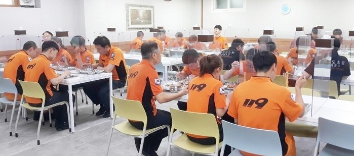 | ▲ 안산소방서 직원들이 비말차단 칸막이가 설치된 구내식당에서 식사를 하고 있다.(사진=안산소방서 제공) |
