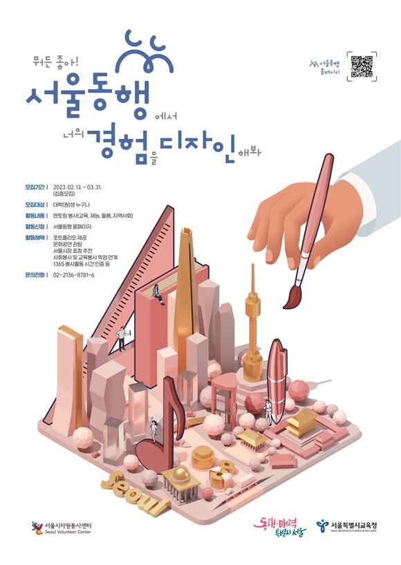 2023년도 서울동행은 ‘너의 경험을 디자인 해봐’라는 핵심 메시지로 체계적인 시스템과 운영 관리를 통해 대학(원)생의 경험을 구체화해 진로에 연계하고 자기주도적 경험을 쌓을 수 있는 환경을 제공한다.