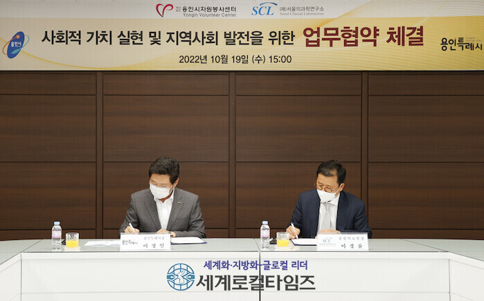 [세계로컬타임즈 이지안 기자] 용인시자원봉사센터(이사장 이상일)는 19일 용인시청에서 서울의과학연구소(총괄의료원장 이경률)와 업무협약을 체결했다.