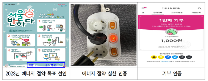 에너지 절약 소셜미디어 참여잇기는 서울시민 누구나 자율적으로 개인 소셜미디어에 2023년 에너지 절약 목표 선언하거나 에너지 절약 실천 행동, 에너지 취약계층을 위한 기부 등을 사진과 글로 인증하고, ‘#Zero Seoul’, ‘#짠테크에너지절약’, ‘#서울e반하다’를 해시태크해 참여할 수 있다.