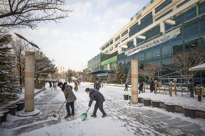 | ▲ 직원들이 시민들이 눈길에 미끌어지지 않게 눈을 치우고 있다. (사진=계양구 제공) |