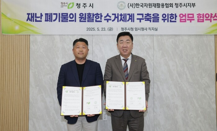 [세계로컬타임즈] 청주시는 23일 한국자원재활용협회 청주시지회와 재난폐기물 수거 체계 구축을 위한 업무협약을 체결했다.
