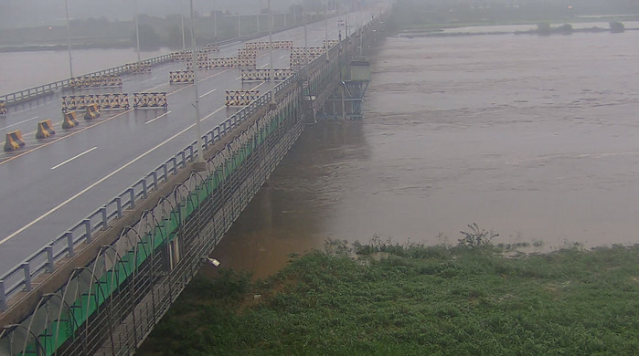 | ▲서울·경기 등 중부지방을 중심으로 호우경보가 내려진 3일 오전 집중호우로 인해 경기 파주시 통일대교 수위가 상승하고 있다. (사진=한강홍수통제소 CCTV 갈무리) |