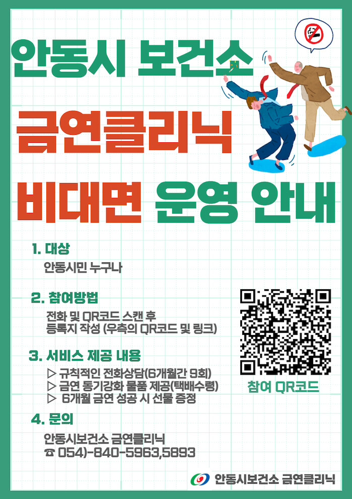 [세계로컬타임즈 이장학 기자] 안동시는 흡연자들의 금연을 돕기 위해 대면 또는 비대면 (QR코드로 간편 등록) 방식을 병행한 탄력적인 금연클리닉 서비스를 선보인다.