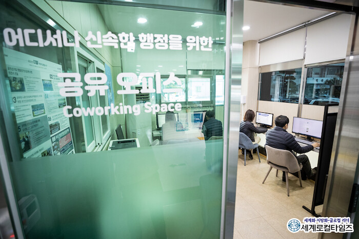 ‘공유오피스’는 본청 1층 현관에 설치돼 직원들이 행정전산시스템에 접속할 수 있는 사무용 컴퓨터와 프린터, 앉아서 대기할 수 있는 테이블, 의자 등으로 구성됐다.