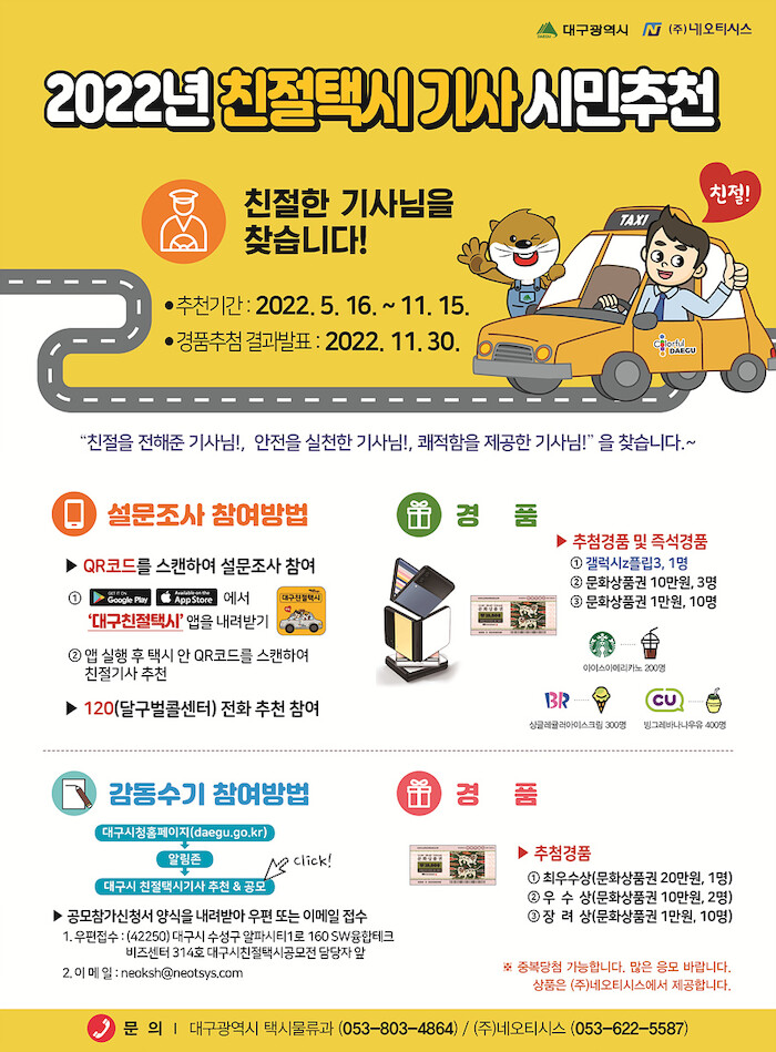 또한 2022년 친절 택시기사 선정을 위한 시민추천이 5월 16일부터 11월 15일까지 진행 중이다.