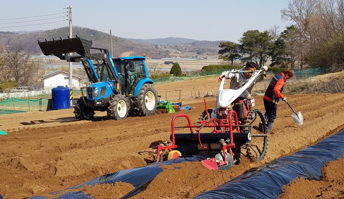 ▲ 농촌 취약계층인 75세 이상 고령농업인에게 밭 농작업을 대행해주는 것을 오는 10일까지 신청할 수 있다. 사진은 대행업체가 밭에 비닐을 두둑에 씌우고 있는 모습. (사진=강화군 제공) |