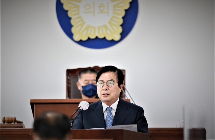 | ▲19일 제334회 장성군의회 제2차 정례회에서 유두석 장성군수가 시정발표를 하고 있다.(사진=장성군 제공) |