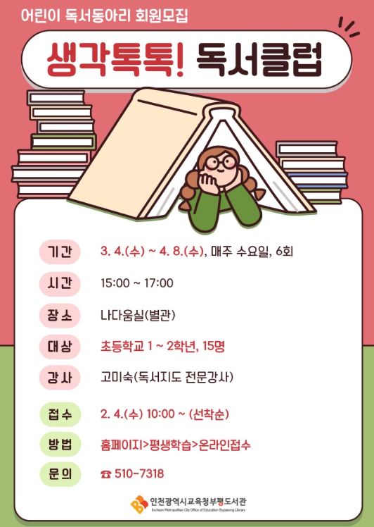 모집은 2월 6일 오전 10시부터 부평도서관 누리집에서 선착순으로 진행되며, 관내 초등학교 1~2학년 학생이면 신청할 수 있다.