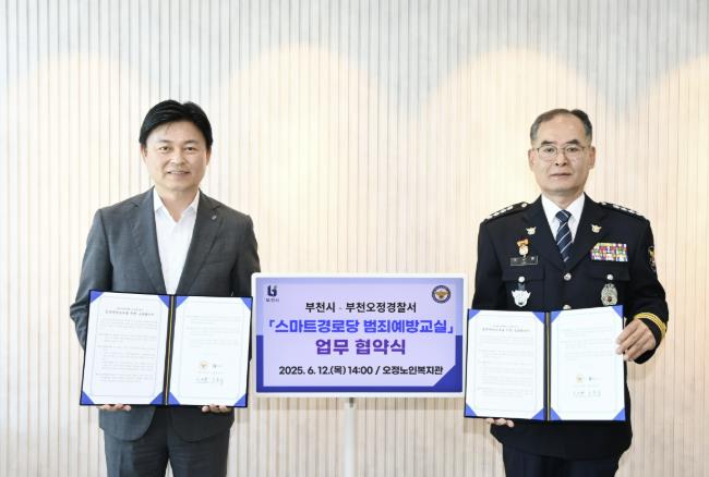 협약에 따라 부천시와 오정경찰서는 스마트경로당을 활용해 △각종 피싱 △노인학대 △교통사고 △투자사기 등 노년층 주요 범죄유형에 대한 맞춤형 예방교육을 정기적으로 운영할 계획이다.