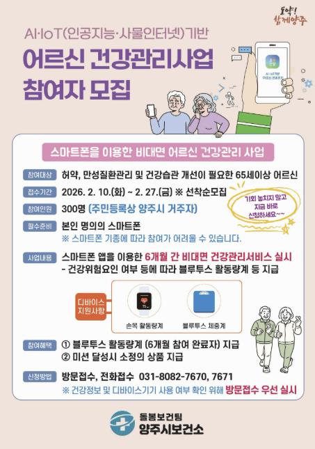 모집 대상은 주민등록상 양주시에 거주하는 65세 이상 어르신으로, 허약·만성질환 관리 또는 건강습관 개선이 필요한 경우 신청할 수 있다.