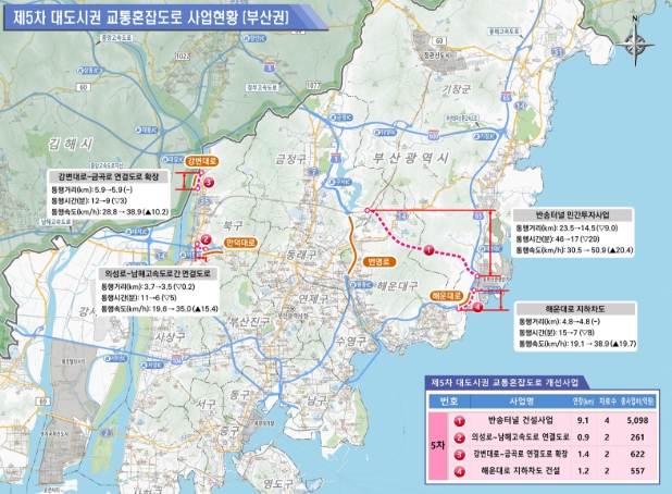 이번 개선사업계획에 포함된 6대 광역시별 주요 사업은 부산광역시 해운대 센텀2지구 ~ 오시리아 관광단지 간 직결로 부산시 외곽 순환도로망을 완성하는 터널을 신설하여 통행시간을 대폭 단축하고, 고속도로 입구와 접속도로 병목구간의 교통혼잡을 해소한다.