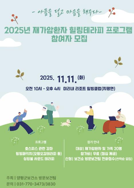 신청 대상은 가정에서 치료 또는 요양 중인 재가암환자와 그 가족이며, 대상자는 양평군 보건소로 전화 또는 방문을 통해 신청이 가능하다.
