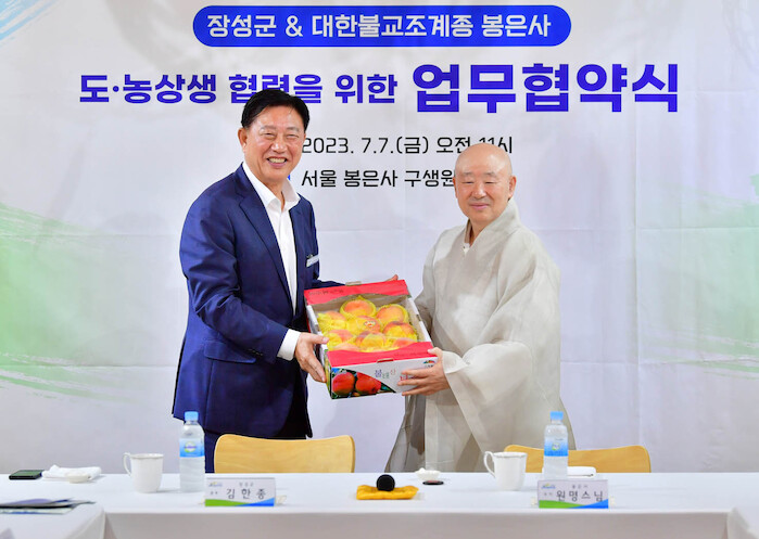 [세계로컬타임즈 이남규 기자] 전남 장성군이 서울 강남 한복판에 있는 봉은사와 도농상생 업무협약을 체결했다.