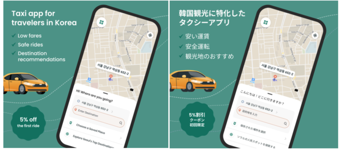 앱은 구글 플레이(안드로이드)와 앱스토어(아이폰)에서 다운로드가 가능하며 출시를 기념해 첫 번째 이용에 한정해 택시요금 5% 할인 서비스를 진행한다.