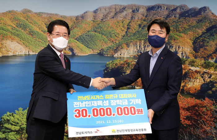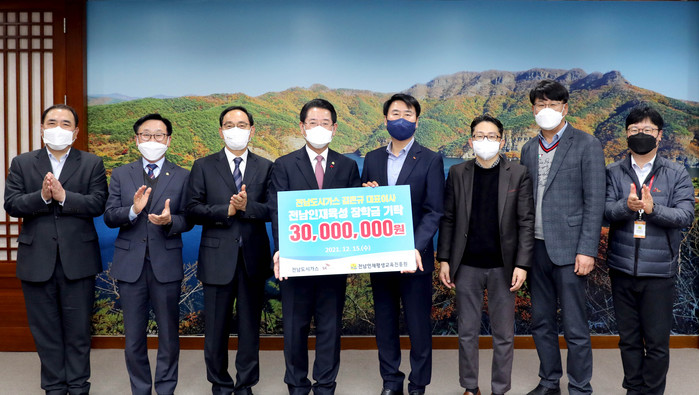 [세계로컬타임즈 김명진 기자] (재)전남인재평생교육진흥원(이사장 김영록)이 15일 전남도시가스(주)로부터 전남인재육성을 위한 장학금 3천만 원을 기탁받았다.