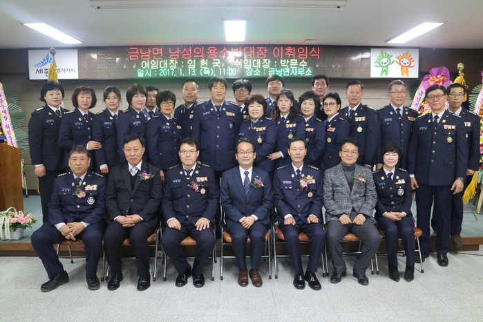 | ▲ 지난 13일 세종시 금남면사무소에서 금남면 의용소방대장 이·취임식을 개최한 후 참석자들이 단체로 기념촬영하고 있다.<사진제공=세종시청> |