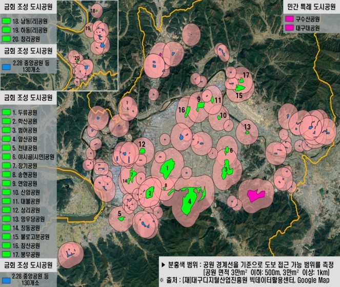 이에 근린공원의 73% 정도를 확보하게 됐으며, 도심지역 내에 거주하는 대부분의 대구시민은 도보로 1Km 범위 내의 공원 접근이 가능하게 됐다. (출처 : 재단법인 대구디지털산업진흥원 빅데이터센터 분석자료, ’19. 8월)