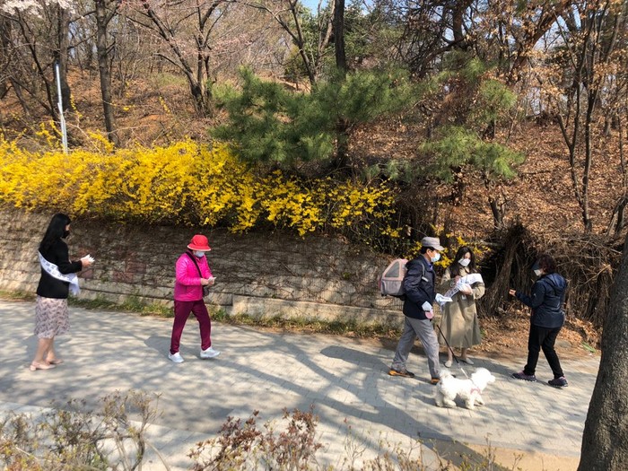 | ▲ 인천시 남동구 공무원들이 벚꽃길 방문객들에게 사회적 거리두기 지침에 따라 벚꽃길 방문자제을 요청하고 있다. (사진=남동구 제공) |
