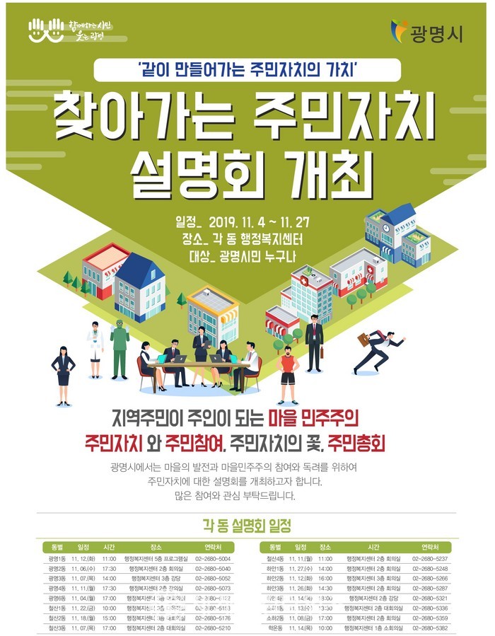 오는 16일~27일 시범 동을 제외한 16개 동을 대상으로 설명회가 개최되며, 광명시민은 누구나 거주 지역에 상관없이 동별 일정에 따라 원하는 동에서 설명회를 들을 수 있다.