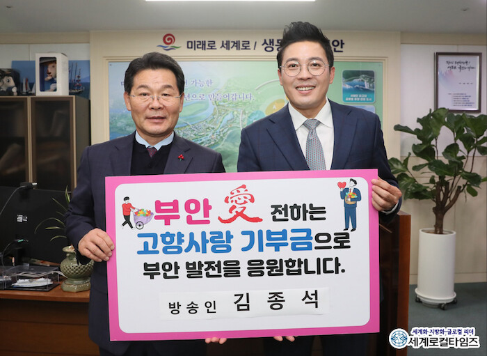 [세계로컬타임즈 조주연 기자] 방송인 김종석씨가 최근 전북 부안군에 고향사랑기부금 100만 원을 전한 것으로 알려졌다.