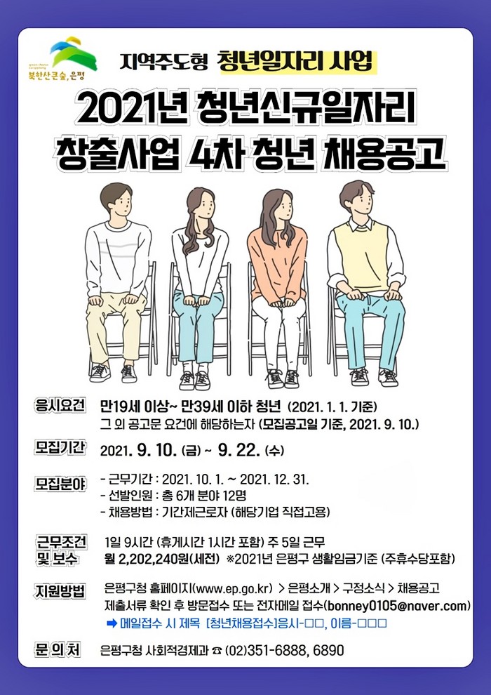 [세계로컬타임즈 손성창 기자]서울시 은평구는 청년 구직난 해소를 위해 ‘2021년 행정안전부 지역주도형 청년일자리’ 4차 공개 모집을 통해 오는 22일까지 6개 분야에서 총 12명의 청년을 채용한다. ‘행정안전부 지역주도형 청년일자리 공모사업’은 청년에게 적합한 지역 일자리를 발굴·제공해 경제활동과 직무역량 강화를 지원하고, 지역사회에 필요한 다양한 서비스를 청년의 일자리로 마련해 제공한다.