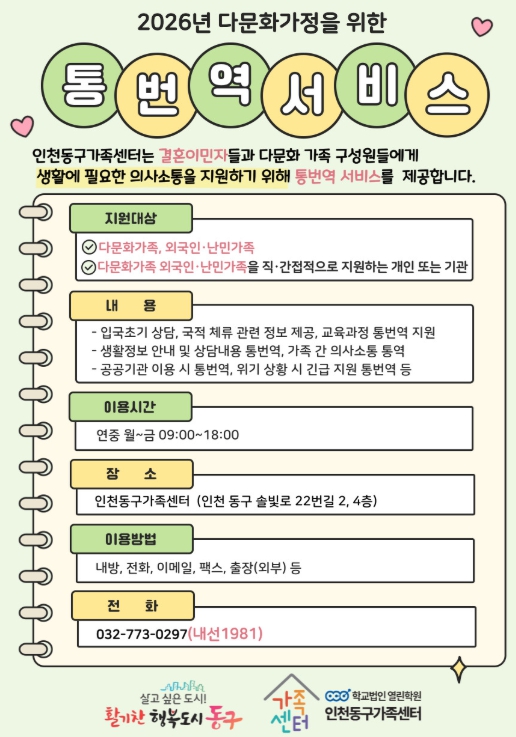 서비스 신청은 센터 방문은 물론 전화, 이메일, 팩스, 외부 출장 통역 등 다양한 방식으로 가능해 이용자의 접근성을 높였다. 자세한 내용은 인천동구가족센터로 문의하거나 센터 홈페이지를 통해 확인할 수 있다.