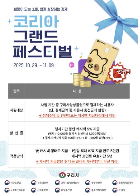 이번 사업은 통합 국가 단위의 할인 축제인 ‘코리아 그랜드 페스티벌’의 취지에 맞춰 지역 내 소비 촉진과 소상공인 매출 증대를 도모하기 위한 정책으로, 구리 시민들에게 실질적인 소비 혜택을 제공함으로써 지역경제에 활력을 불어넣는 것이 목적이다.