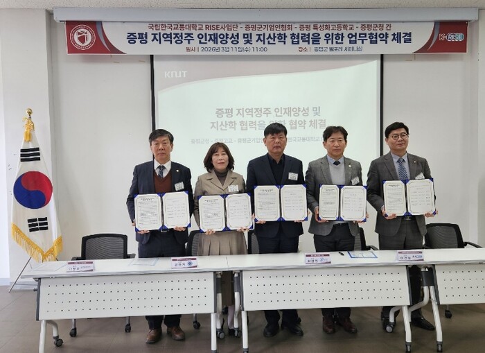 군은 11일 벨포레리조트에서 증평공업고등학교, 충북비즈니스고등학교, 증평군기업인협회, 국립한국교통대학교 RISE사업단과 함께 지역 취업 및 진학 확대를 위한 지·산·학 협력 협약을 체결했다.
