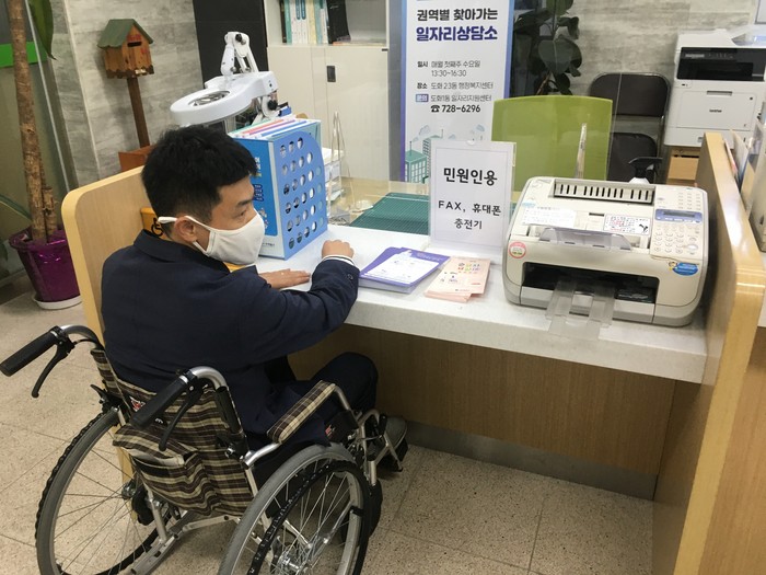 | ▲ 휠체어를 이용하는 시민이 행정복지센터에서 민원 상담을 하고있다. (사진=미추홀구 제공) |
