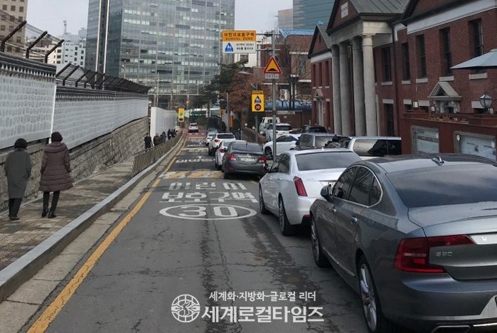 ▲서울시 중구에 위치한 초등학교 어린이 보호구역 앞에 주·정차한 차량 (사진=세계로컬타임즈 DB) |