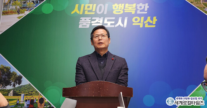 ▲8일 오전 익산시 최봉섭 바이오농정국장이 브리핑을 하고 있다. |