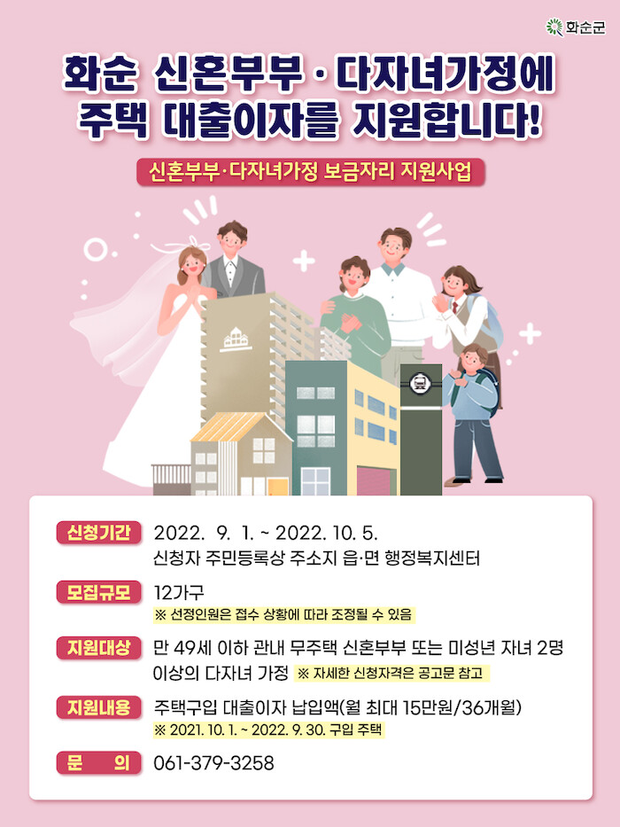 | ▲2022년 신혼부부·다자녀가정의 보금자리 지원사업 대상자 모집 포스터 (사진=화순군) |