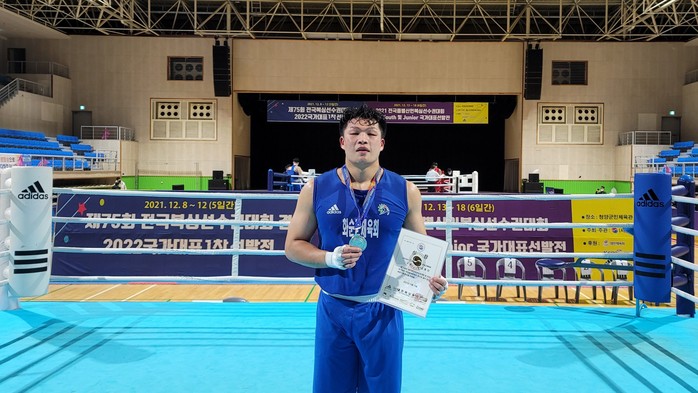| ▲2022 복싱 국가대표 선발전에서 화순군체육회 김종진 선수가 남자 –81㎏급에서 준우승을 차지하며 복싱 국가대표에 1차 선발됐다. 사진은 준우승을 차지한 김종진 선수 경기 후 기념촬영 모습(사진=화순군) |