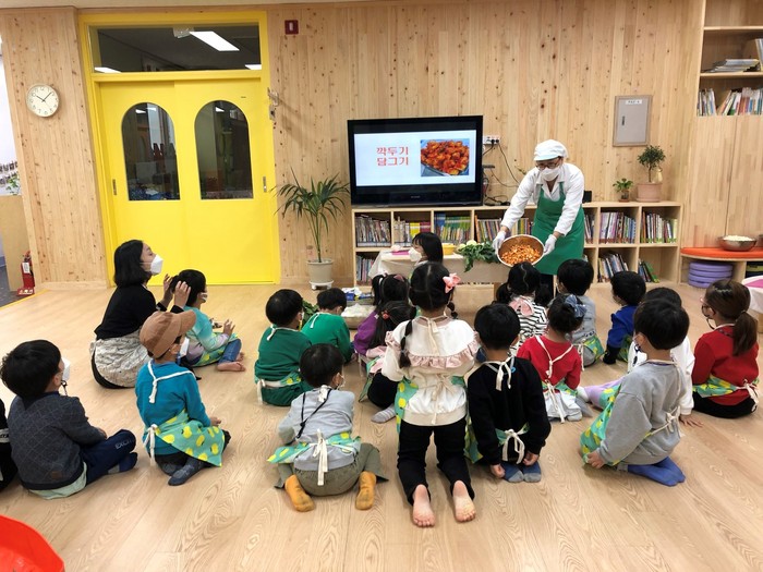 | ▲조리사와 깍두기를 만드는 방법을 알아보고 있는 유아들 모습 |