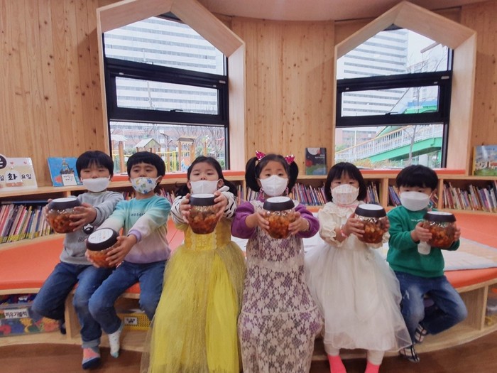 | ▲만든 깍두기를 들고 좋아하는 유아들 모습 |