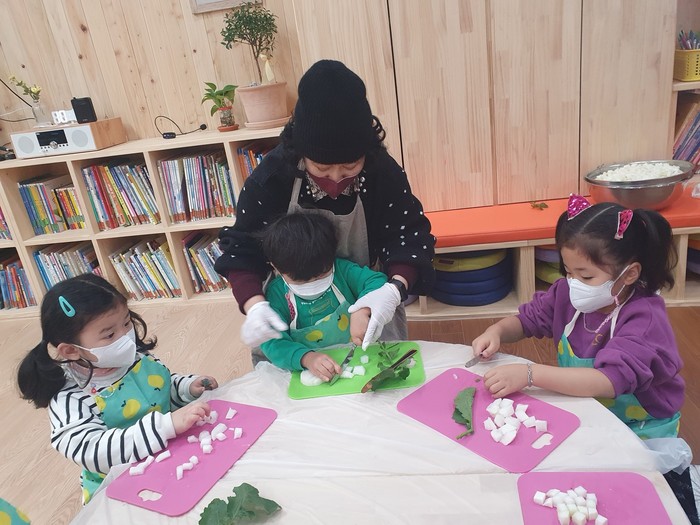 | ▲원장 교사와 함께 깍두기를 만들고 있는 유아들 모습 |