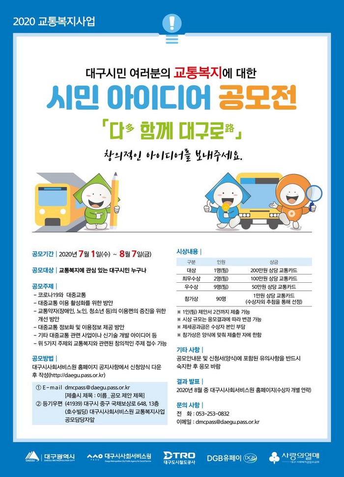 [세계로컬타임즈 최영주 기자] 대구시 사회서비스원은 지역 특성에 맞는 혁신적인 교통복지 사업 발굴과 교통복지에 대한 시민들의 관심을 높이기 위해 ‘다 함께 대구로’ 시민 아이디어 공모전을 개최한다.