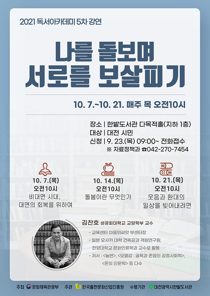 [세계로컬타임즈 민순혜 기자] 한밭도서관은 10월 7일부터 매주 목요일 2시간씩 3회 일정으로 2021년 독서아카데미 5차 강연 ‘나를 돌보며 서로를 보살피기’를 진행한다.