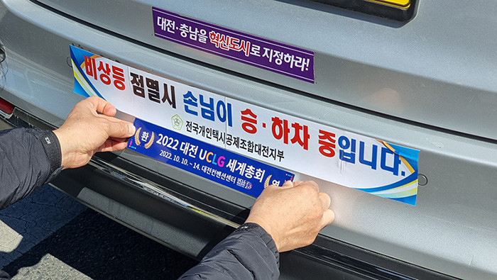2022 대전 세계지방정부연합 총회 조직위에 따르면 조직위는 대전시 택시 2,000여 대를 활용한 래핑 광고를 통해 대전과 인근 시·군 등을 대상으로 홍보활동을 펼칠 계획이다. 택시 래핑은 대전시민사랑협의회와 전국모범운전자연합회 대전지부의 지원으로 이뤄져 총회의 성공개최에 대한 시민 염원을 보탰다.