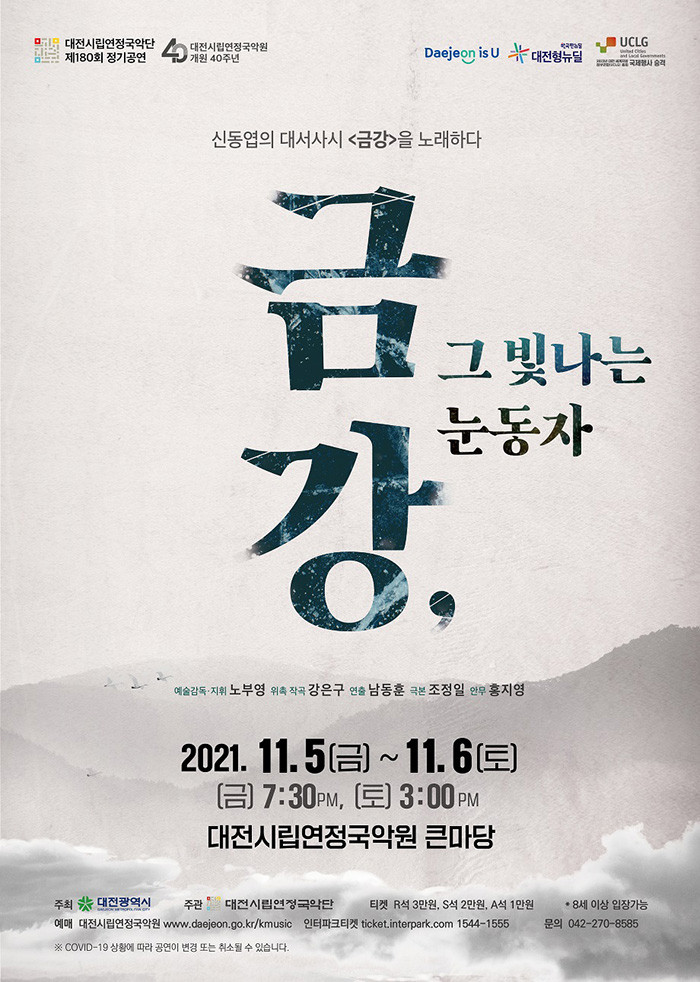 ‘금강, 그 빛나는 눈동자’는 분단 이후 대한민국 시문학사에서 최고의 걸작으로 손꼽히는 신동엽의 대서사시 '금강'을 무대화한 작품으로, 전곡을 위촉해 국악관현악과 성악으로 창작한 최초의 국악칸타타다.