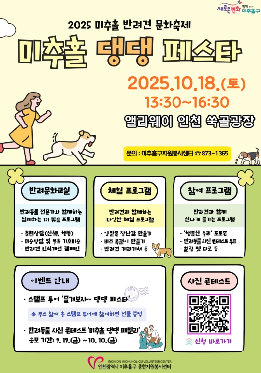 특히 사전 프로그램으로 진행되는 반려동물 사진 콘테스트 ‘미추홀 댕댕 패밀리’의 응모 기간은 오는 10월 10일까지이며, 센터는 접수된 사진 중 10개 작품을 선정해 행사 당일 현장 투표를 통해 최종 수상작을 가릴 예정이다.