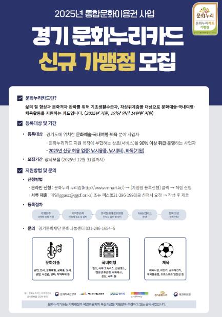 한편, 문화누리카드 사업은 문화체육관광부, 한국문화예술위원회, 경기도, 경기문화재단이 공동 추진하며, 국민들이 보다 쉽게 문화를 향유할 수 있도록 지원하고, 소득 차이에 따른 문화 불평등 해소를 목표로 기획재정부 복권위원회의 복권기금을 받아 운영된다. 2025년에는 1인당 연간 14만 원이 지원되며, 전국 문화누리카드 가맹점에서 사용할 수 있다. 카드 잔액은 2025년 12월 31일까지 사용해야 하며, 미사용 금액은 국고로 환수된다.