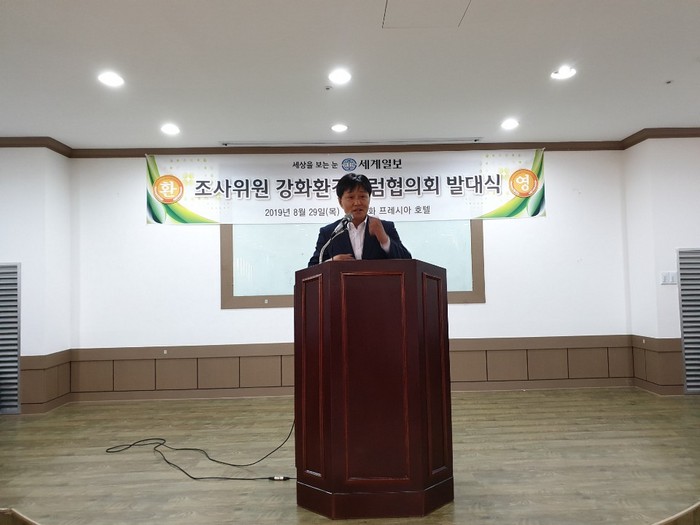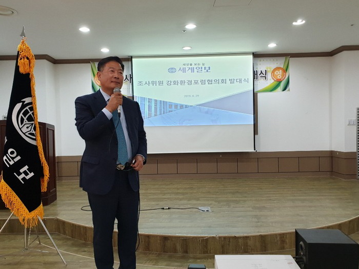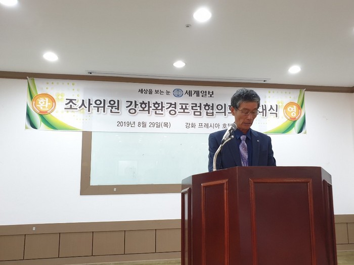 | ▲ 민명섭 세계일보 조사위원 강화환경포럼협의회 회장이 취임사를 하고 있다. |
