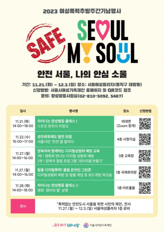 폭력 없는 안전한 서울을 조성하고자 마련된 이번 행사는 ▲아동학대 예방 및 대응을 위한 토크 콘서트와 전시 ▲디지털성범죄·스토킹 범죄예방 교육 및 워크숍 등 다양한 프로그램으로 구성돼 있다.