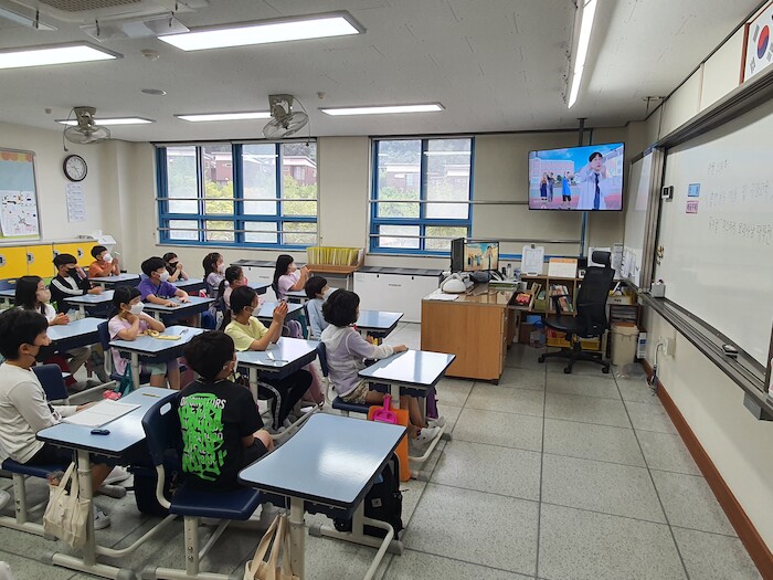 | ▲ 기흥구 석성초등학교 학생들이 교실에서 뮤지컬로 제작된 흡연 음주 예방 교육 영상을 시청하고 있다. (사진=용인시) |