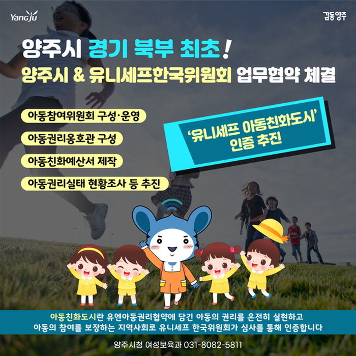 경기 북부 최초로 유니세프 아동친화도시 인증을 추진하고 있는 양주시는 2020년 10월 아동친화도시 조성에 관한 조례 제정을 시작으로 아동친화도시 조성 추진 계획 수립, 아동친화도시 위원회 구성 등 아동의 권리가 존중되는 행복한 양주시를 만들기 위한 제도적 기반을 다지고 있다.