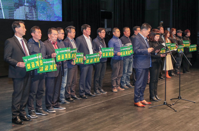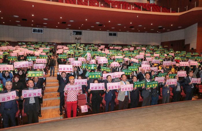 | ▲2020충남체전의 성공 개최를 다짐하는 행사에서 참가자들이 '성공개최' 팻말을 들어보이고 있다. (사진=당진시 제공) |