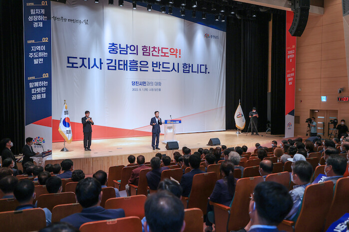 이날 김 지사는 오성환 당진시장 등 시 공직자 환담, 기자간담회와 김덕주 의장 및 시의원과의 면담에 이어 당진홀에서 지역기관‧단체장 및 시민과의 대화 시간을 가졌다.